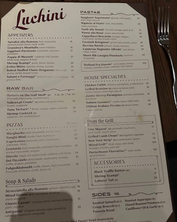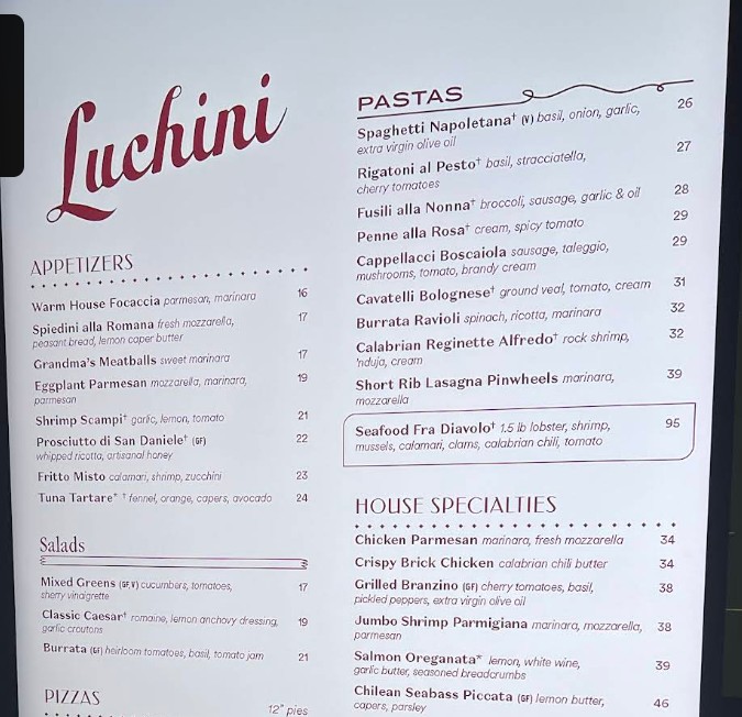 Dining at Luchini was an absolute delight from start to finish. The appetizers were generously portioned and packed with flavor—each bite set the stage perfectly. One standout detail was the Caesar salad: the dressing was beautifully balanced, enhancing the freshness without overwhelming the greens. What truly impressed me was the menu—it felt like it was designed to make dining effortless, offering great value with thoughtful pairings like a glass of wine and an after-dinner drink included. The pasta was perfectly al dente, with just the right texture and taste to leave a lasting impression. The atmosphere was cozy and welcoming, though I did wish there was just a bit more lighting to brighten the space. Still, the vibe felt intimate and enjoyable. ⭐ Special shoutout to our server, Matthew! He was attentive, knowledgeable, and added so much warmth to the experience. From answering all our questions to offering extra plates so we could sample each other’s meals, his service went above and beyond. My glass was never empty, and the care he showed made us feel genuinely welcomed. Overall, Luchini serves up a memorable Italian experience with rich flavors, excellent service, and a charming ambiance. Highly recommended for anyone craving a satisfying meal with thoughtful hospitality.