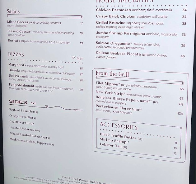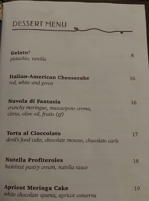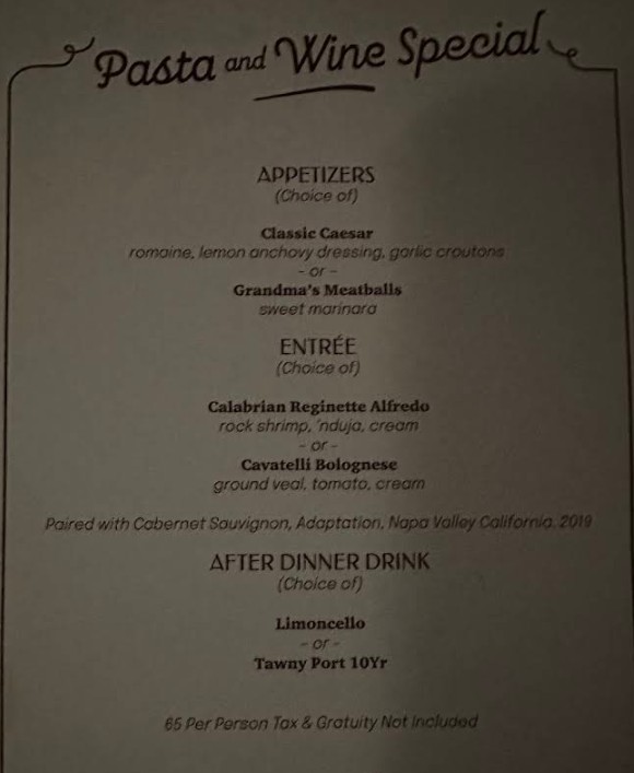 A surprise for us. This is a pleasant sea of tranquility in the storm of MGM Grand crowds, noise and lights. Subdued with a low level of lighting and competent quick service, we had a very fine dinner with minimal fuss. The menu is not large but there are a couple of vegetarian dishes, sorry vegans are going to strike out unless they opt for some vegetable sides. Wine list and beers are adequate and background music is subdued unless you are seated at or near the bar. Prices are reasonable for Vegas and seating is generous. Recommend getting to dinner early as the place fills with large tables of conventioneers and it can get a little loud as the evening progresses. Pasta dishes were very traditional and very good although portions were on the smaller side. If pasta is your main course order an appetizer. The focaccia was exceptional. We give it four Google stars or 3.5 clams in the coveted Five Quahog Rating Scale.